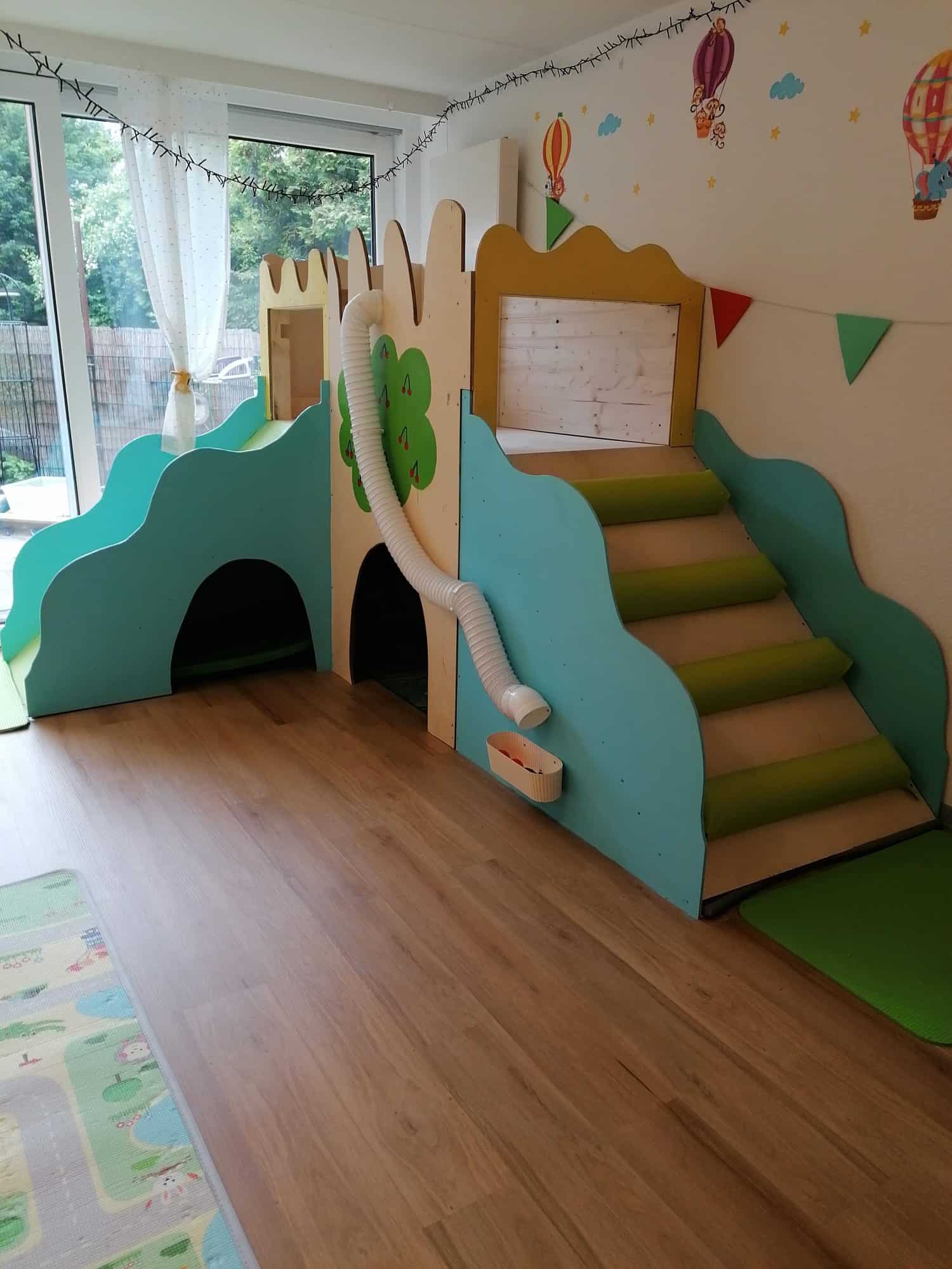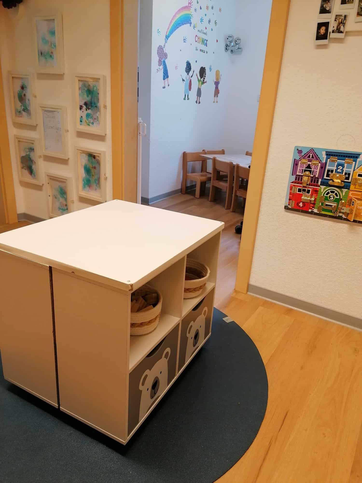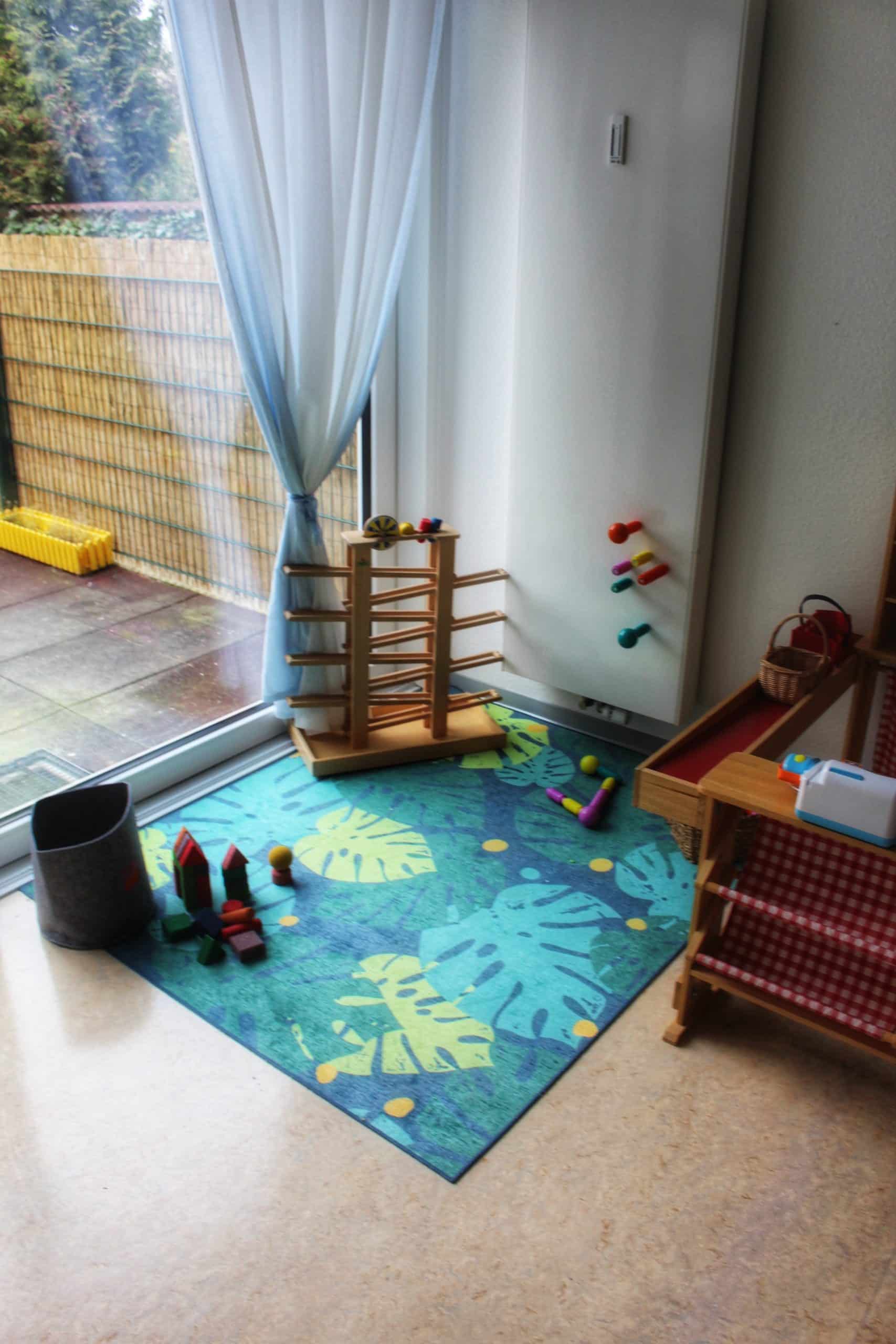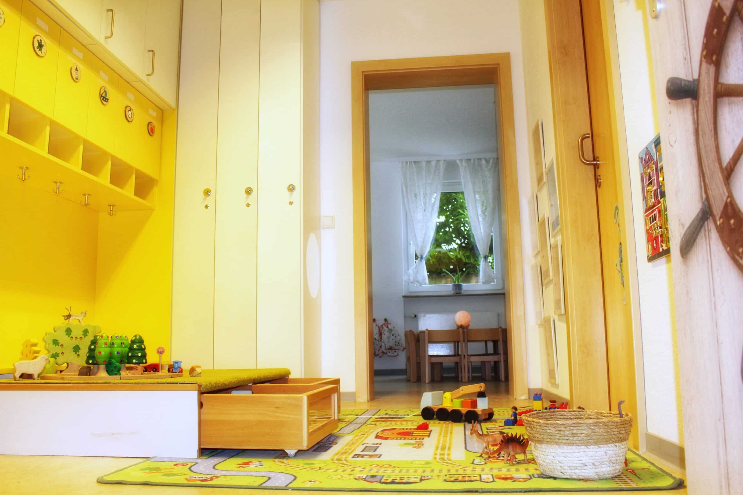 Unser kleinerer Betreuungsraum wird durch unsere geräumige Diele (Bespielbar, sobald die Tür zu ist und alle Kinder angekommen sind) erweitert, sodass die Kinder genug Platz zum Spielen, Lachen und auch für einen Rückzugsort haben.