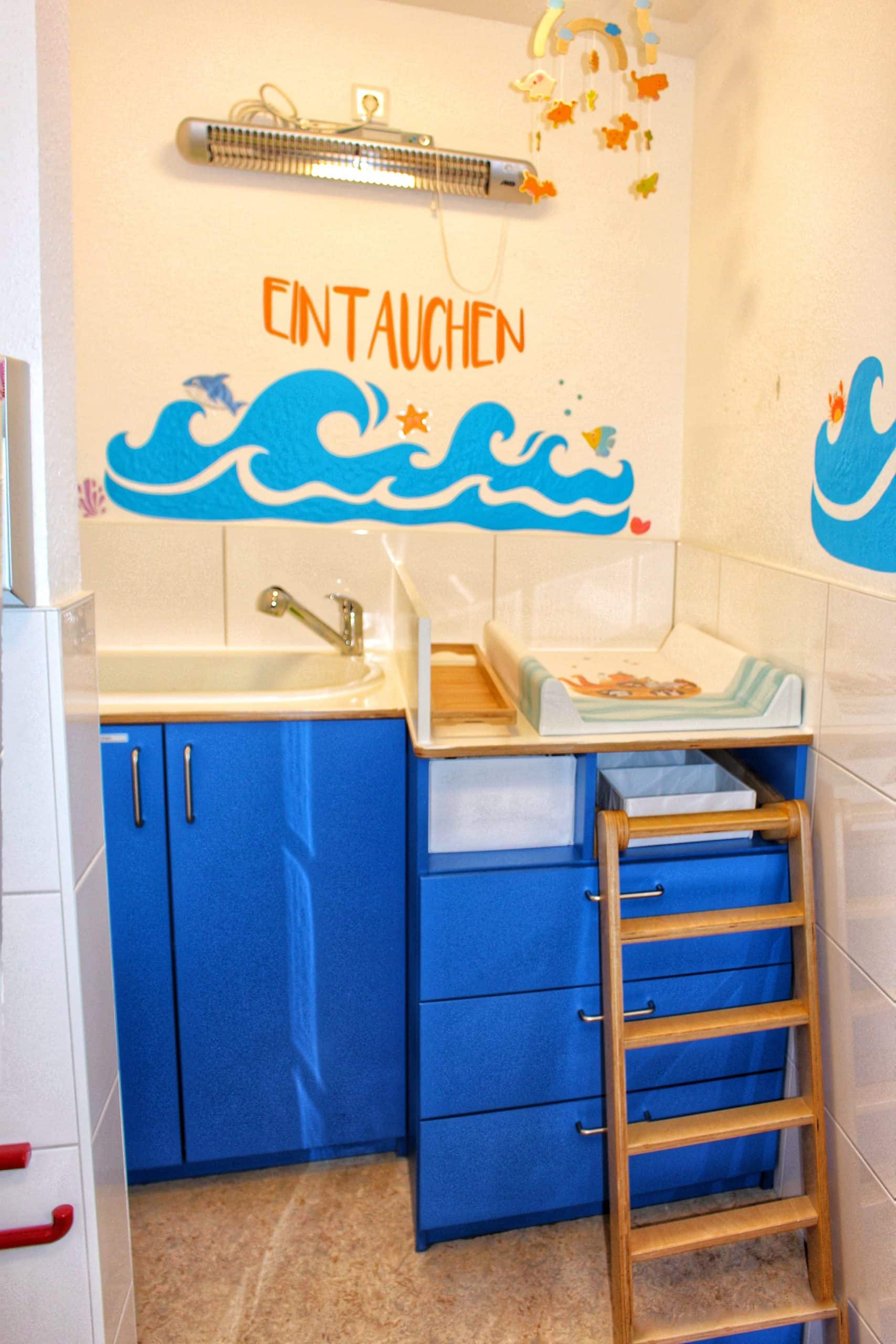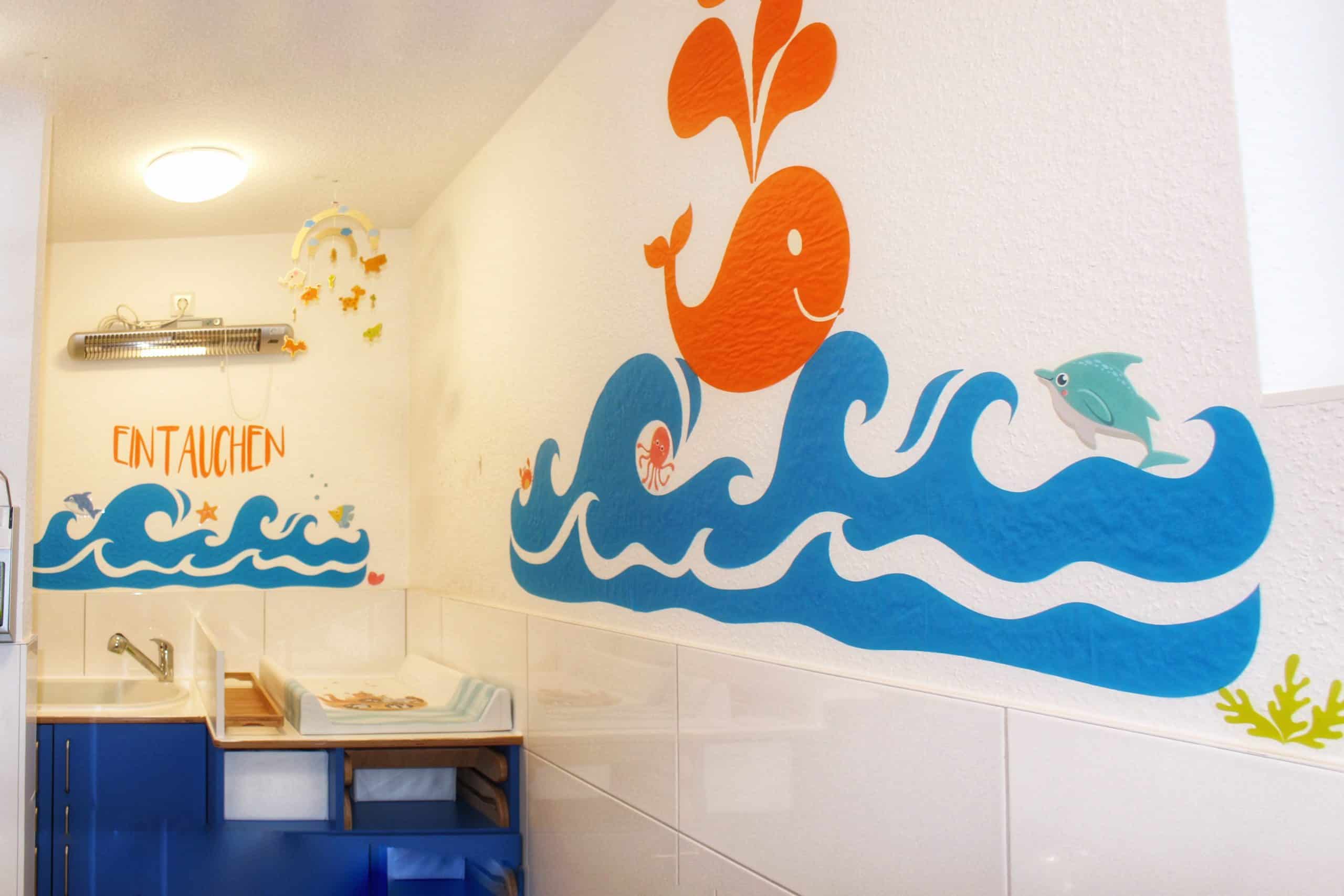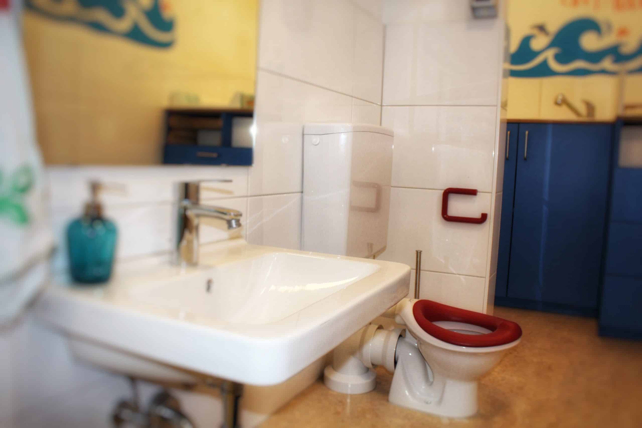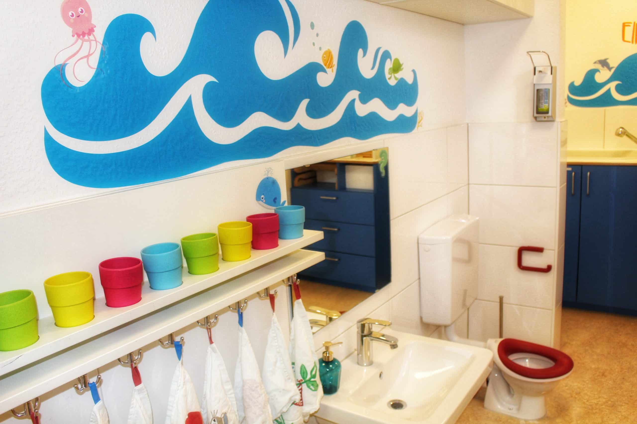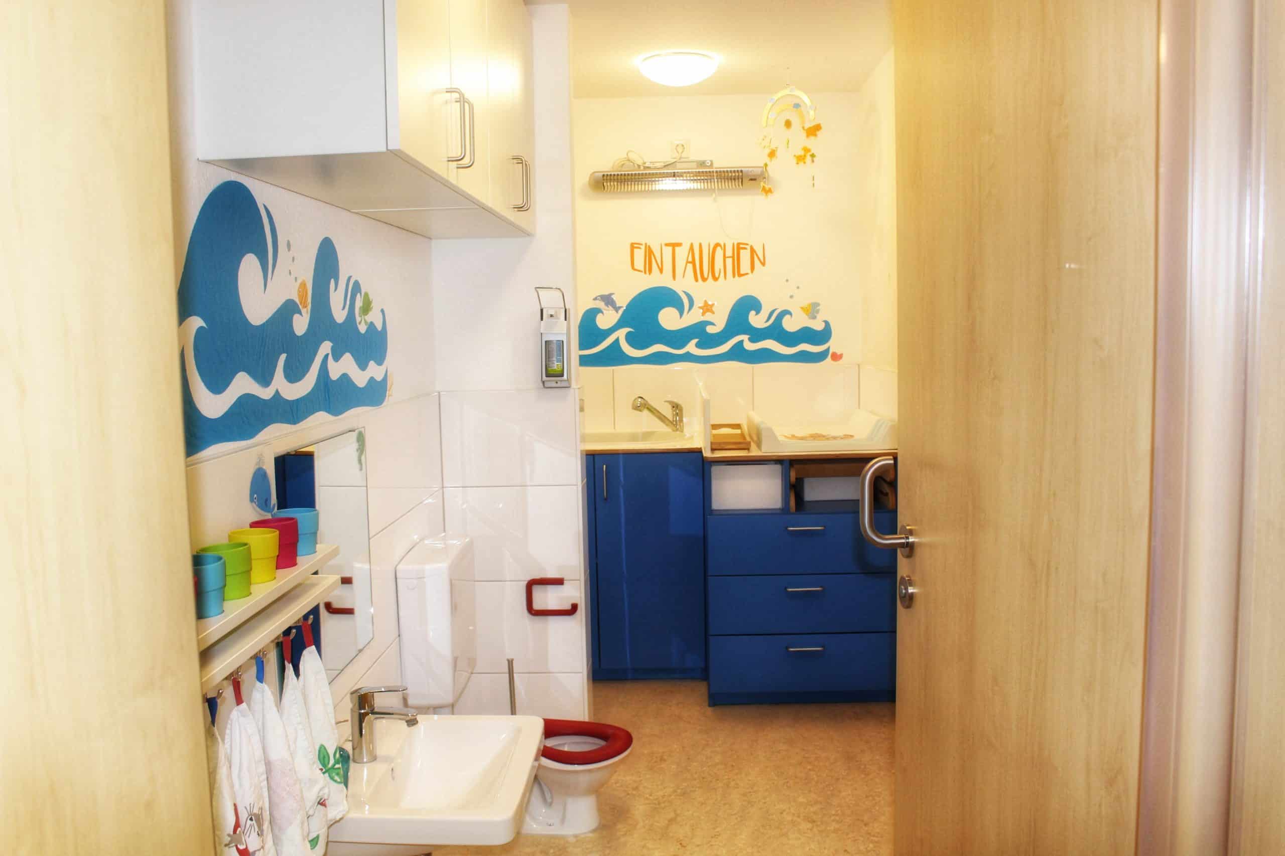 Unser Kinderwaschraum beinhaltet einen Wickeltisch mit Wanne und Wärmelampe, Waschbecken und auch eine Mini-Toilette. So ermöglichen wir den Kindern das Erlernen des selbstständigen Toilettengangs und die dazugehörige Hygiene.